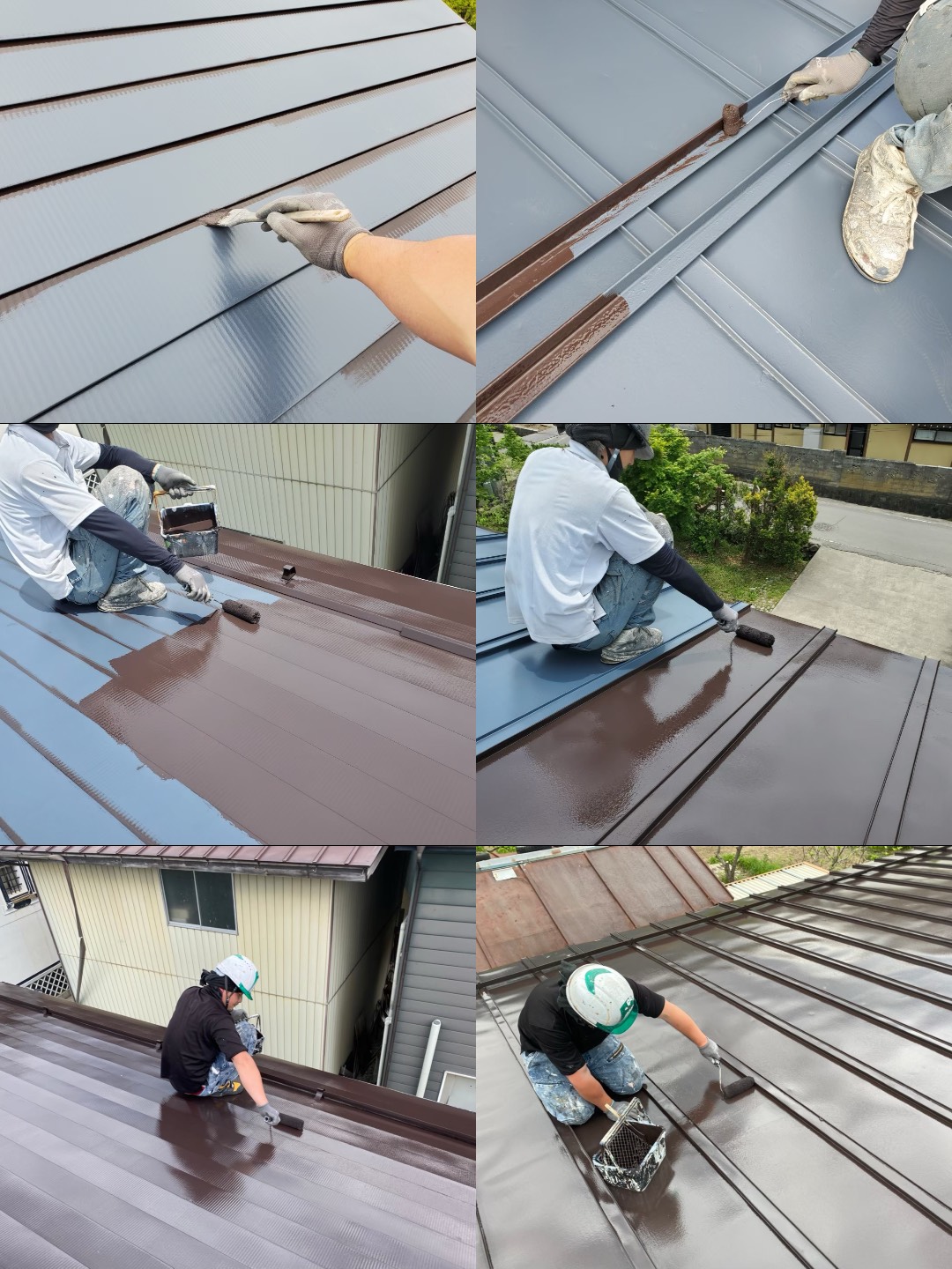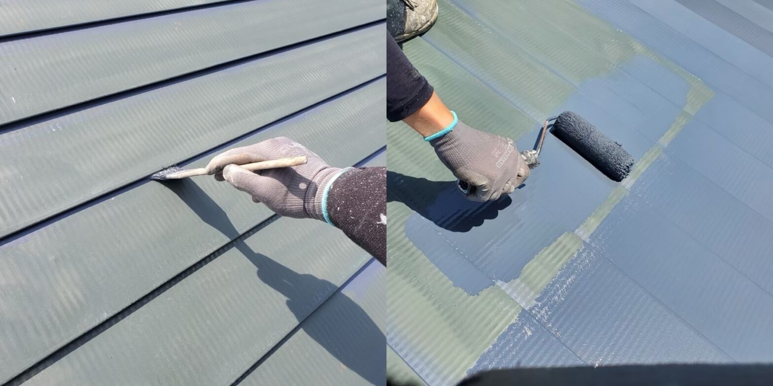 屋根中塗り/上塗り・・・錆止め同様、隅々まで上塗りを二回塗布します。塗料の性能を最大限発揮するため必ず二回重ね塗りを行います。