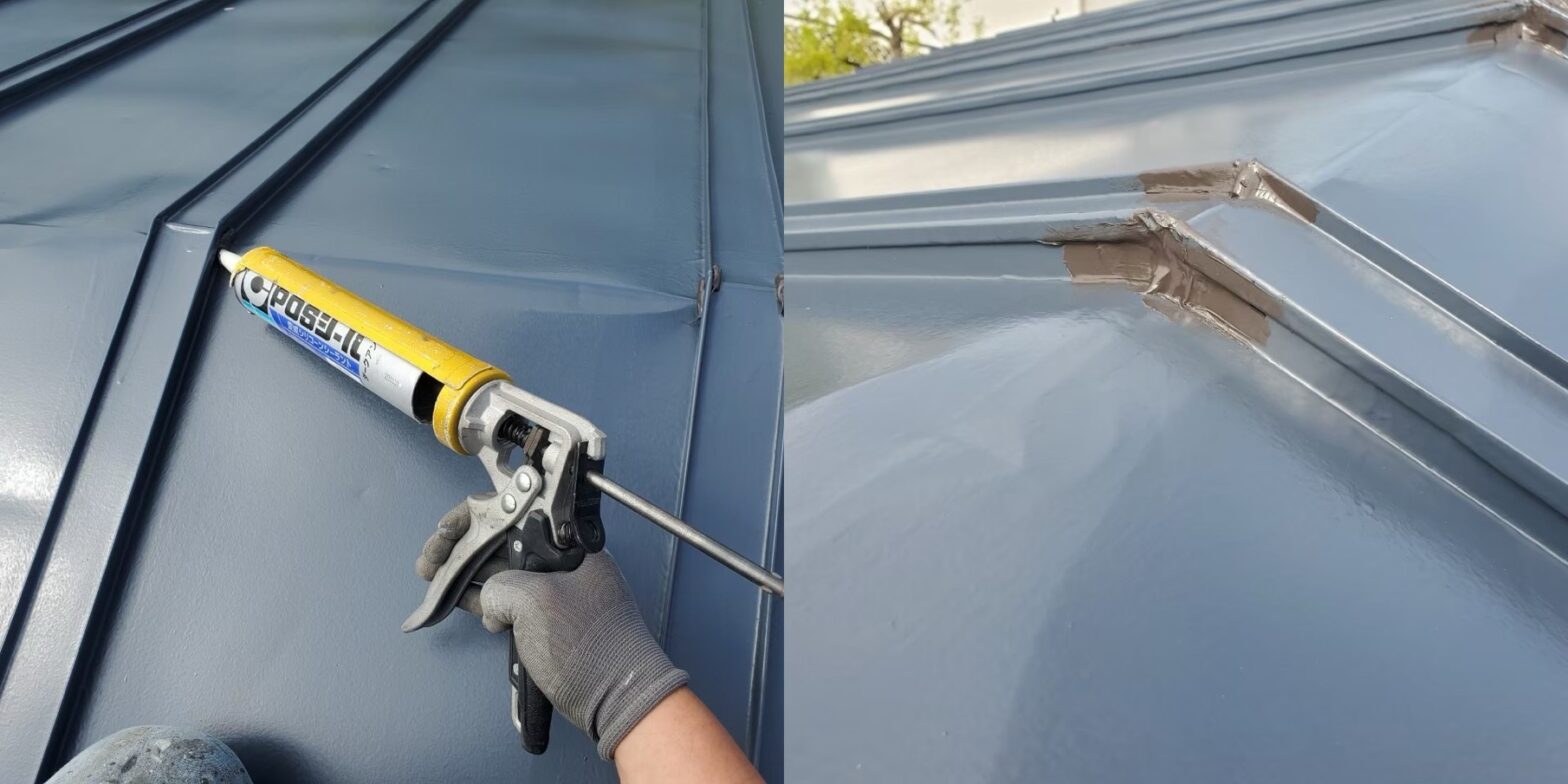 コーキング・・・屋根の棟部に笠木が付いていないため折れ部に切れが見られました。雨漏りの原因になるのでコーキングにて防水処理します。