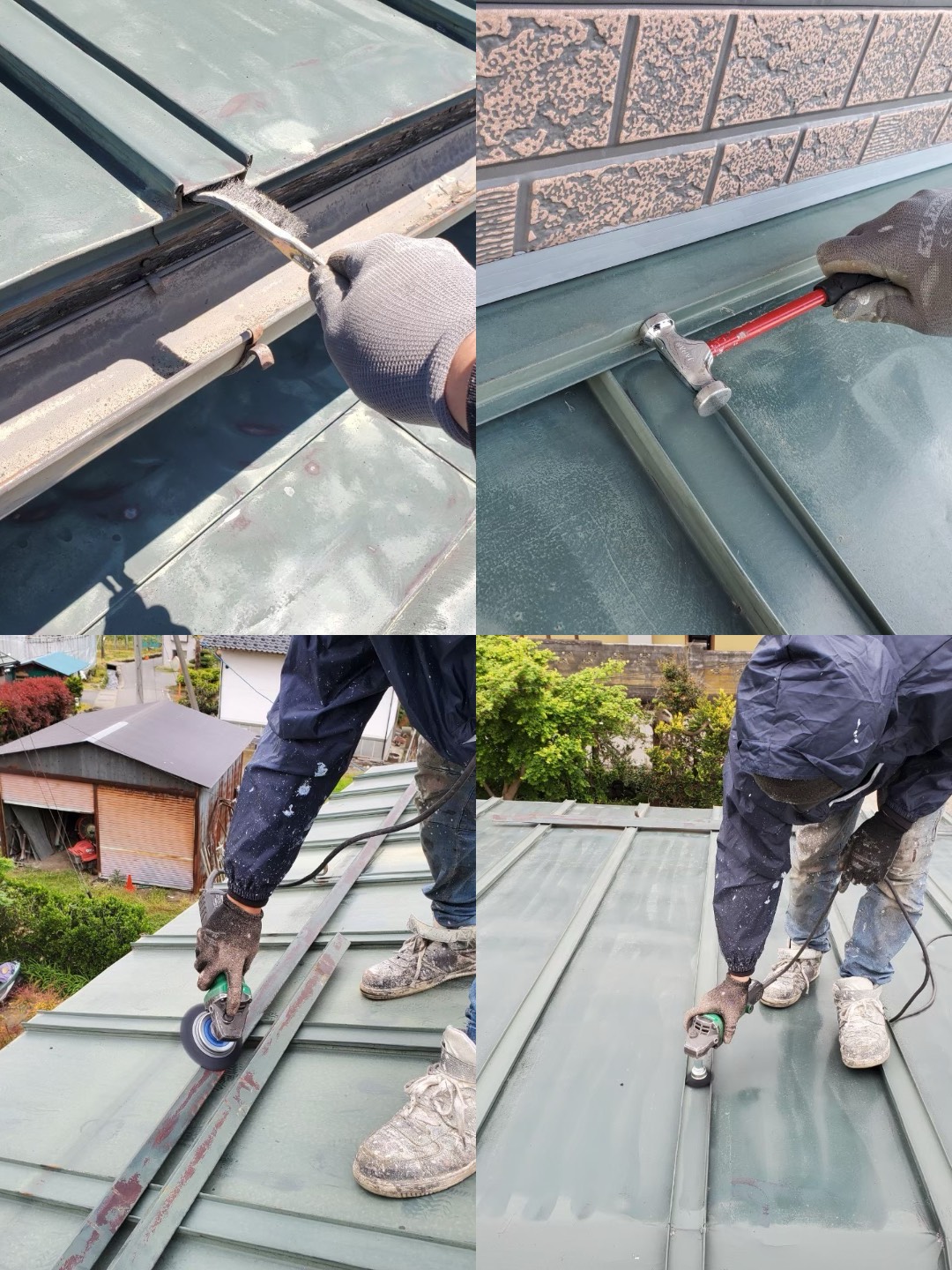 ケレン・・・細かなサビや旧塗膜の浮きを除去し、塗料の密着性を高めました。屋根塗装においてケレン作業はとても大事な工程になります。広い面は電動工具使用し、細かな箇所はワイヤーブラシ等の手工具にて入念に施工しました。また、釘の浮き部なども打ち込み直しなす。