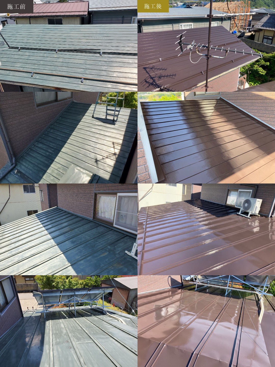 落ち着きのあるブラウン系カラーで統一し、艶のある美しい仕上がりになりました。屋根全体をしっかり塗装し、防水性・耐久性ともに大幅に向上します。